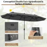 Nom du produit COSTWAY Parasol Double de Jardin Extra Large Haute 240cm, avec Base Lestée, 12 Baleines Métalliques, pour Cour, Piscine, Gris