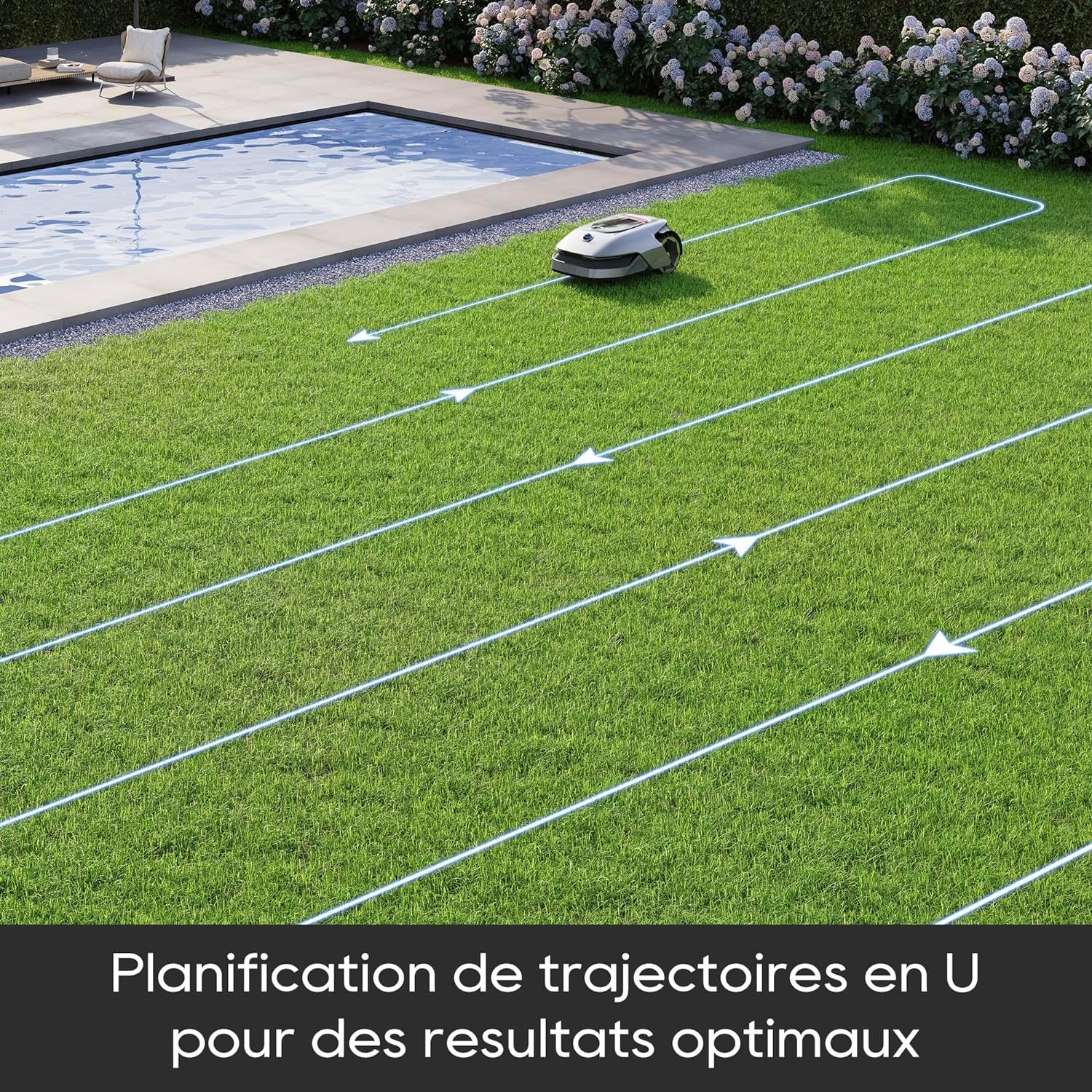 - Planification de trajectoires en U pour des résultats optimaux:L’A1 fonctionne selon une trajectoire en U novatrice qui couvre parfaitement votre pelouse, pour une uniformité et une qualité de coupe impressionnantes. Des terrains spacieux jusqu’à 1 000 m² peuvent être entièrement entretenus en seulement 24 heures*