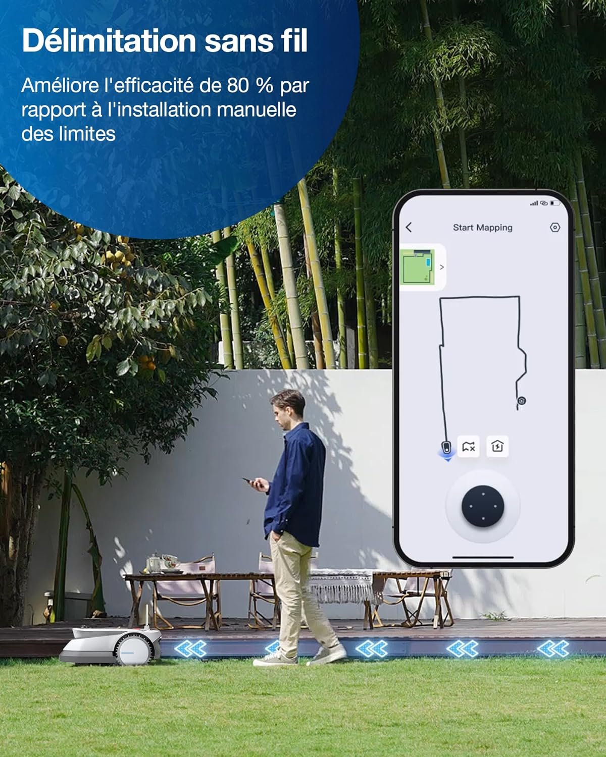 • Méthode de délimitation sans fil】Dites adieu à l’installation manuelle traditionnelle des délimitations grâce à la méthode de délimitation sans fil. Remplacez les fils électroniques par un signal balistique et procédez à la délimitation sans fil d’un jardin standard en un seul clic sur l’application, ce qui permet d’améliorer l’efficacité de la délimitation grâce à une transmission de signal plus stable et à une capacité anti-interférence renforcée.