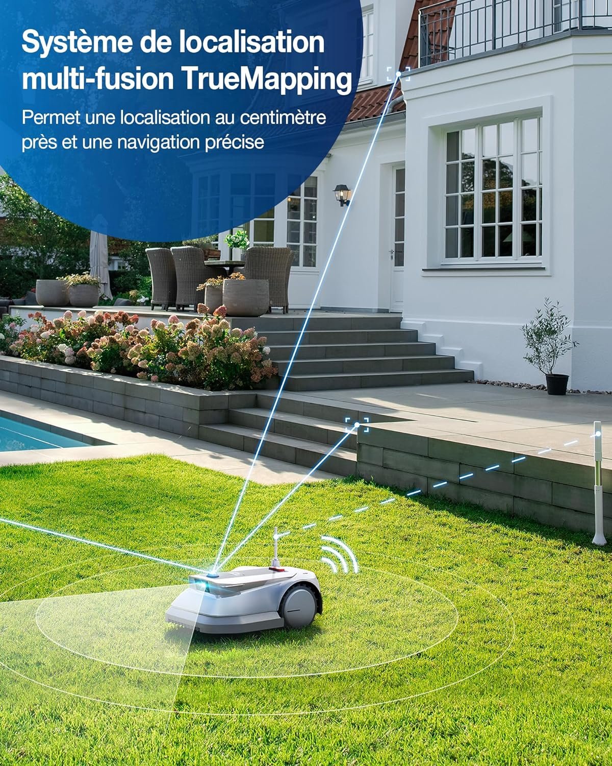 • 【Système de localisation multifusionnel TrueMapping】 solution de vision double intégrée (caméra panoramique+caméra fisheye) avec des technologies de communication sans fil à ondes porteuses à bande ultra-large, de navigation inertielle et de localisation par GPS. La transmission du signal est plus stable que la technologie de localisation RTK pure. Grâce au système TrueMapping, le Goat réalise une coupe parfaitement homogène par bandes logiques et procure une expérience de tonte particulièrement efficace.