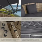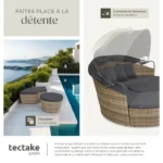 | Description du produit | Découvrez le bain de soleil rond au design contemporain luxueux SANTORIN, conçu pour transformer votre jardin, terrasse ou piscine en un véritable havre de paix. Avec ce mobilier de jardin modulable, vous pouvez créer une atmosphère de détente parfaite grâce à son design élégant et ses caractéristiques innovantes. Mobilier de jardin modulable SANTORIN : Bain de soleil ou salon de jardin Le bain de soleil rond SANTORIN se distingue par sa modularité exceptionnelle. Vous pouvez utiliser les différents éléments pour créer une grande surface de couchage spacieuse ou les disposer individuellement comme un salon compact. Le tabouret rond est particulièrement polyvalent, servant aussi bien de siège avec coussin que de petite table d’appoint sans coussin. Ce transat jardin polyvalent s’adapte à toutes vos envies de détente en plein air. Confort et Durabilité : Bain de soleil SANTORIN Pour un confort inégalé, le bain de soleil SANTORIN est équipé de coussins moelleux avec revêtement hydrofuge. Les housses amovibles et nettoyables permettent un entretien facile et rapide. Profitez de moments de relaxation en tout confort grâce au pare-soleil rétractable et réglable, idéal pour vous protéger des rayons UV tout en profitant de votre chaise longue jardin. Les pieds réglables en hauteur ajoutent une touche de praticité supplémentaire, permettant une stabilité parfaite sur n’importe quel terrain. Profitez du Soleil ou Détendez-vous à l’Ombre Que vous souhaitiez bronzer au soleil ou vous détendre à l’ombre, le bain de soleil rond SANTORIN répond à toutes vos attentes. Le toit solaire, doté d’un système de vérins à gaz, se replie facilement et peut être fixé grâce à des fermetures auto-agrippantes pratiques. Ce dispositif vous permet de moduler l’ombre au gré de vos envies, assurant une expérience de relaxation ultime dans votre jardin. Caractéristiques Exceptionnelles du Bain de soleil rond SANTORIN Le bain de soleil SANTORIN est conçu en rotin robuste et résistant aux UV, garantissant une longue durée de vie et une utilisation sans souci. Ce mobilier de jardin est un incontournable pour ceux qui recherchent à la fois style et fonctionnalité. Les coussins imperméables ajoutent une touche de luxe, tout en assurant un confort d’assise exceptionnel. Conclusion Transformez votre espace extérieur avec le bain de soleil rond au design contemporain luxueux SANTORIN. Ce mobilier modulable vous offre une flexibilité sans égale, un confort maximal et une durabilité à toute épreuve. Que ce soit pour vous détendre seul ou en compagnie de vos proches, ce bain de soleil est la solution idéale pour savourer pleinement les beaux jours. Profitez dès maintenant de ce produit exclusif et faites de votre jardin un paradis de détente. |