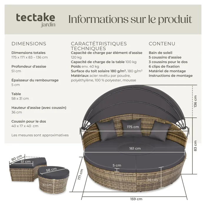 Découvrez le bain de soleil rond au design contemporain luxueux SANTORIN, conçu pour transformer votre jardin, terrasse ou piscine en un véritable havre de paix. Avec ce mobilier de jardin modulable, vous pouvez créer une atmosphère de détente parfaite grâce à son design élégant et ses caractéristiques innovantes.Mobilier de jardin modulable SANTORIN : Bain de soleil ou salon de jardinLe bain de soleil rond SANTORIN se distingue par sa modularité exceptionnelle. Vous pouvez utiliser les différents éléments pour créer une grande surface de couchage spacieuse ou les disposer individuellement comme un salon compact. Le tabouret rond est particulièrement polyvalent, servant aussi bien de siège avec coussin que de petite table d’appoint sans coussin. Ce transat jardin polyvalent s’adapte à toutes vos envies de détente en plein air.Confort et Durabilité : Bain de soleil SANTORINPour un confort inégalé, le bain de soleil SANTORIN est équipé de coussins moelleux avec revêtement hydrofuge. Les housses amovibles et nettoyables permettent un entretien facile et rapide. Profitez de moments de relaxation en tout confort grâce au pare-soleil rétractable et réglable, idéal pour vous protéger des rayons UV tout en profitant de votre chaise longue jardin. Les pieds réglables en hauteur ajoutent une touche de praticité supplémentaire, permettant une stabilité parfaite sur n’importe quel terrain.Profitez du Soleil ou Détendez-vous à l’OmbreQue vous souhaitiez bronzer au soleil ou vous détendre à l’ombre, le bain de soleil rond SANTORIN répond à toutes vos attentes. Le toit solaire, doté d’un système de vérins à gaz, se replie facilement et peut être fixé grâce à des fermetures auto-agrippantes pratiques. Ce dispositif vous permet de moduler l’ombre au gré de vos envies, assurant une expérience de relaxation ultime dans votre jardin.Caractéristiques Exceptionnelles du Bain de soleil rond SANTORINLe bain de soleil SANTORIN est conçu en rotin robuste et résistant aux UV,