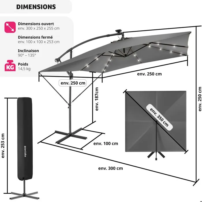 Dimensions 250 x 250 cm (toile), 250 x 300 x 255 cm (dimensions totales), 100 x 100 x 253 cm (dimensions fermé)