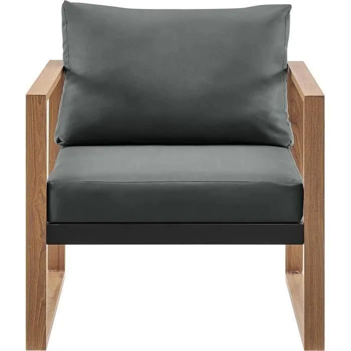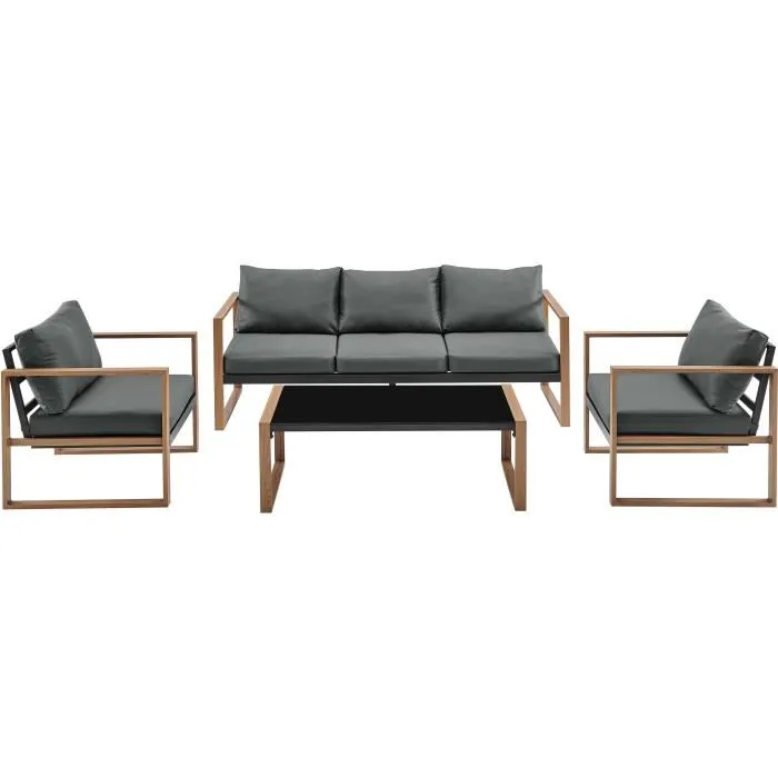 | Nom du produit | Salon bas de jardin en aluminium effet bois avec coussins – 5 personnes – PUERTO – Gris |