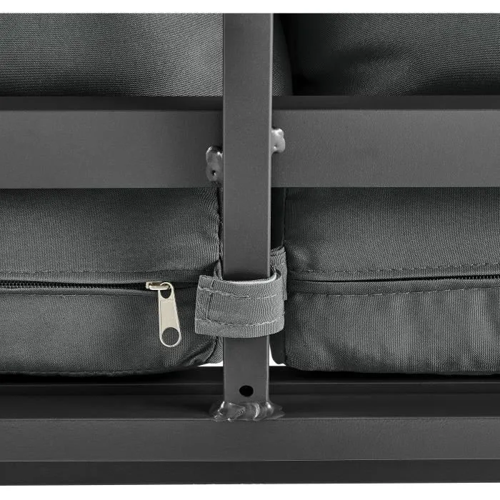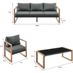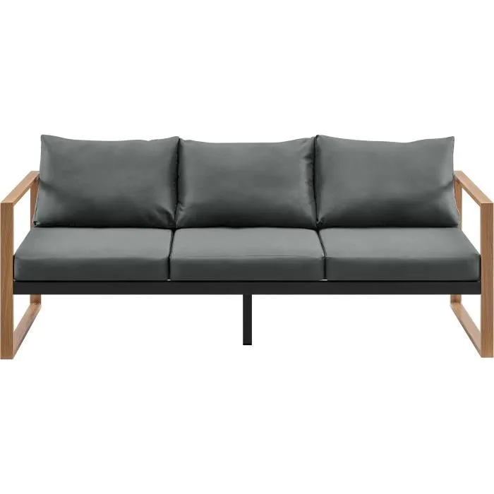 Profitez de moments conviviaux en extérieur avec ce salon de jardin en aluminium effet bois. Composé d’une banquette 3 places, de deux fauteuils et d’une table basse, il peut accueillir jusqu’à 5 personnes. Les coussins gris foncé offrent un grand confort. La structure en aluminium résiste à la rouille et aux intempéries. Design moderne et esthétique.