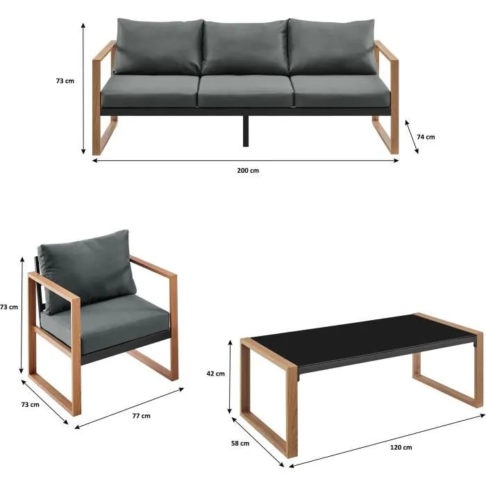 | Dimensions (L x p x h) | fauteuils 77x73x73 cm, canapé 200x74x73 cm, table basse 120x58x42 cm |