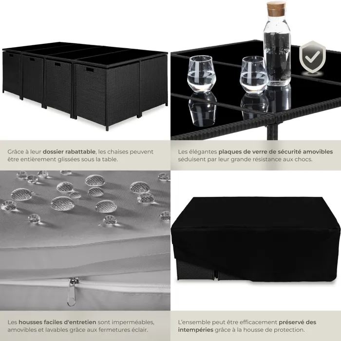 Salon de Jardin Encastrable PALMA – Parfait pour les Grandes FamillesLe Salon de jardin PALMA est le choix idéal pour ceux qui cherchent à combiner élégance et fonctionnalité dans leur espace extérieur. Ce meuble rotin a été conçu pour accueillir confortablement jusqu’à 10 personnes, ce qui en fait un ensemble de jardin parfait pour les grandes familles ou les réunions entre amis. Un Design Intelligemment Conçu pour Économiser de l’EspaceL’une des caractéristiques les plus impressionnantes de cet ensemble de jardin PALMA est son design encastrable. Grâce à un système astucieux permettant de rabattre les dossiers des chaises, vous pouvez ranger l’ensemble facilement et économiser de l’espace. Les chaises se glissent aisément sous la table grâce aux poignées pratiques situées à l’arrière, offrant une solution ingénieuse pour le stockage. Matériaux de Haute Qualité et RésistantsFabriqué en résine tressée, ce mobilier extérieur est à la fois léger et résistant. Il est conçu pour résister aux UV, garantissant ainsi une longue durée de vie même sous un usage intensif en extérieur. La table centrale, avec ses plateaux en verre de sécurité, ajoute une touche de modernité et de sophistication à l’ensemble. Ces plateaux en verre sont faciles à nettoyer, leur brillance étant synonyme de qualité et de modernité. Confort et Praticité au Rendez-vousLe Salon de jardin PALMA offre non seulement un design remarquable mais aussi une grande praticité :- Housse de protection incluse : Lorsqu’il n’est pas utilisé, une housse de protection adaptée peut être glissée sur les éléments repliés. Elle protège efficacement du vent, du soleil, de la poussière et d’autres influences extérieures, contribuant ainsi à la longévité de cet ensemble extérieur.- Coussins de qualité : Les housses des coussins sont facilement amovibles et lavables grâce à une fermeture éclair. Leur surface imperméable garantit un confort optimal et une utilisation sans souci. Parfait pour Toutes les