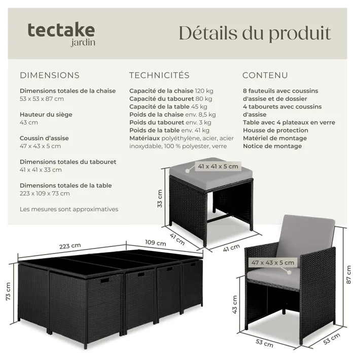 Composition du lot 8 chaises avec coussins 4 tabourets avec coussins 1 table avec 4 plaques de verre 1 housse de protection 1 manuel de montage illustré