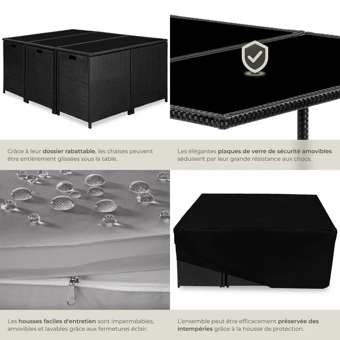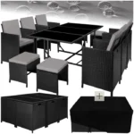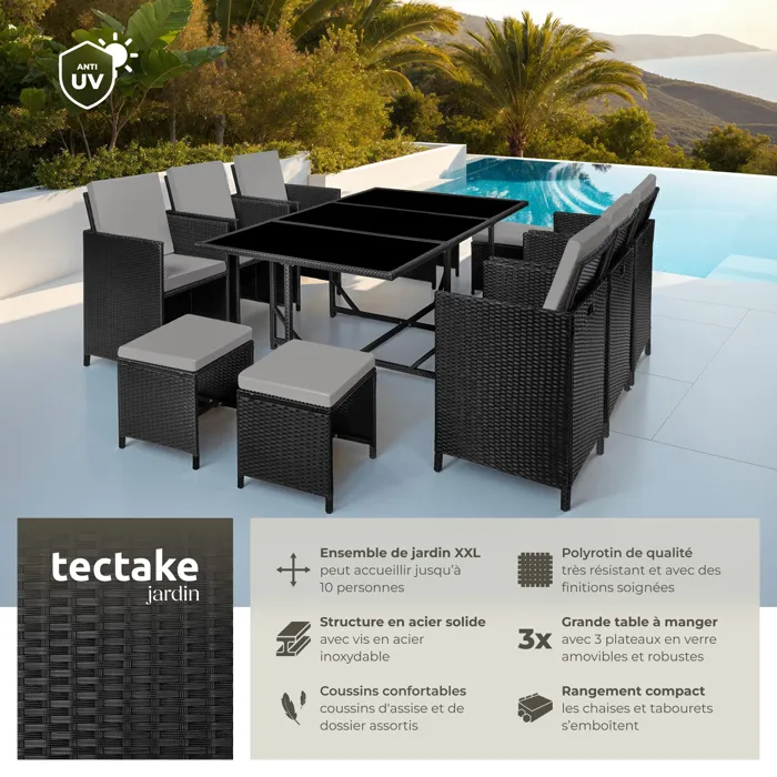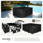 | Nom du produit | Salon de jardin – TECTAKE – Ensemble repas d’extérieur MALAGA 10 personnes pliable encastrable en rotin avec housse – Noir/Gris |