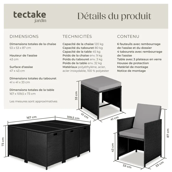 | Composition du lot | 6 fauteuils avec coussins d’assise4 tabourets avec coussins d’assise1 table avec plaques de verre 1 housse de protection 1 manuel de montage illustré |