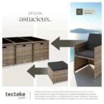 | Description du produit | Salon de jardin – Ensemble Encastrable NEW YORK – Design Contemporain Découvrez le Salon de jardin encastrable NEW YORK, un meuble rotin de haute qualité qui combine élégance et fonctionnalité. Parfait pour l’extérieur comme pour l’intérieur, cet ensemble de jardin est idéal pour le jardin, la terrasse, le balcon, la véranda ou même le salon. Transformez votre espace en un lieu convivial et accueillant grâce à cet ensemble meuble extérieur sophistiqué. Confort et Espace Optimisé Vous souhaitez organiser une garden-party avec de nombreux invités? Aucun problème avec notre Salon de jardin NEW YORK. Conçu pour accueillir confortablement 6 à 10 personnes, cet ensemble comprend des chaises avec dossiers repliables et des tabourets polyvalents qui peuvent également servir de repose-pieds. Lorsqu’ils ne sont pas utilisés, les dossiers se replient et les chaises se glissent complètement sous la table, permettant ainsi un rangement facile et peu encombrant. Ce système ingénieux vous fera gagner du temps et de l’espace, tout en maintenant une ambiance ordonnée dans votre jardin. Table Spacieuse et Élégante La grande table du Salon de jardin NEW YORK dispose de trois plateaux en verre de sécurité, mesurant environ 178 x 114 x 72 cm. Ce design moderne et robuste offre une surface généreuse pour accueillir des aliments, des boissons, des jeux, des livres et bien plus encore. Les plateaux en verre noir brillant ajoutent une touche d’élégance et de stabilité, faisant de cette table un élément central de votre mobilier extérieur. Durabilité et Entretien Facile Fabriqué en poly rotin de haute qualité, le tressage de cet ensemble de jardin est antisalissant et résistant aux intempéries, garantissant une longue durée de vie même en extérieur. Pour une protection supplémentaire, une housse de protection est incluse afin de couvrir l’ensemble lorsque celui-ci n’est pas utilisé. Cela contribue à prolonger la durée de vie de votre mobilier. Confort et Adaptabilité Les coussins d’assise confortables et les dossiers rembourrés assurent un excellent confort. De plus, ils sont hydrofuges et leurs surfaces imprégnées permettent aux gouttes d’eau et aux saletés de perler facilement. Vous recevrez deux sets de housses pour les coussins, en gris et beige, vous permettant ainsi d’adapter le look de votre salon selon vos envies. Les housses sont amovibles et faciles à changer grâce à la fermeture éclair pratique à l’arrière. Avec un cadre en aluminium robuste et résistant aux UV, le Salon de jardin NEW YORK est un choix parfait pour ceux qui recherchent un ensemble de mobilier extérieur durable, élégant et pratique. Faites de votre jardin un espace de vie supplémentaire où règnent confort et convivialité. |