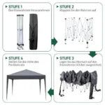 1. Material: Pulverbeschichteter Stahlrahmen und wasserdicht 210d Oxford Stoffabdeckung2. Farbe: grau3. Abmessungen: (300 x 300) cm (l x w)4. Gewicht: 13 kg5. wasserdicht: Ja6. Geeignet für: alle Arten von Ereignissen7. Höhe der Seiten: 196cm8. Dachhöhe: 255 cm